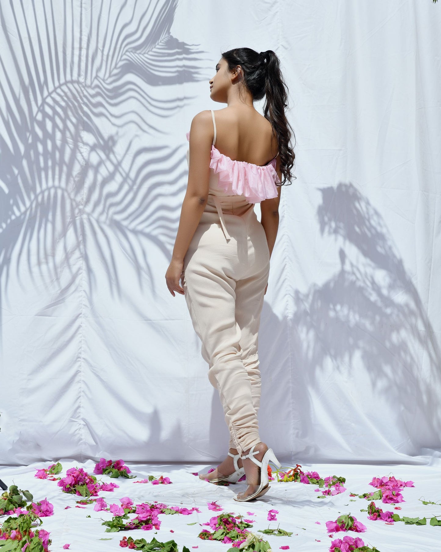 Fitted jumpsuit with organza ruffled neckline front and back, gathered design details along the waist till mid-thigh and hem, slick belt with golden round buckle and zip closure at the back.