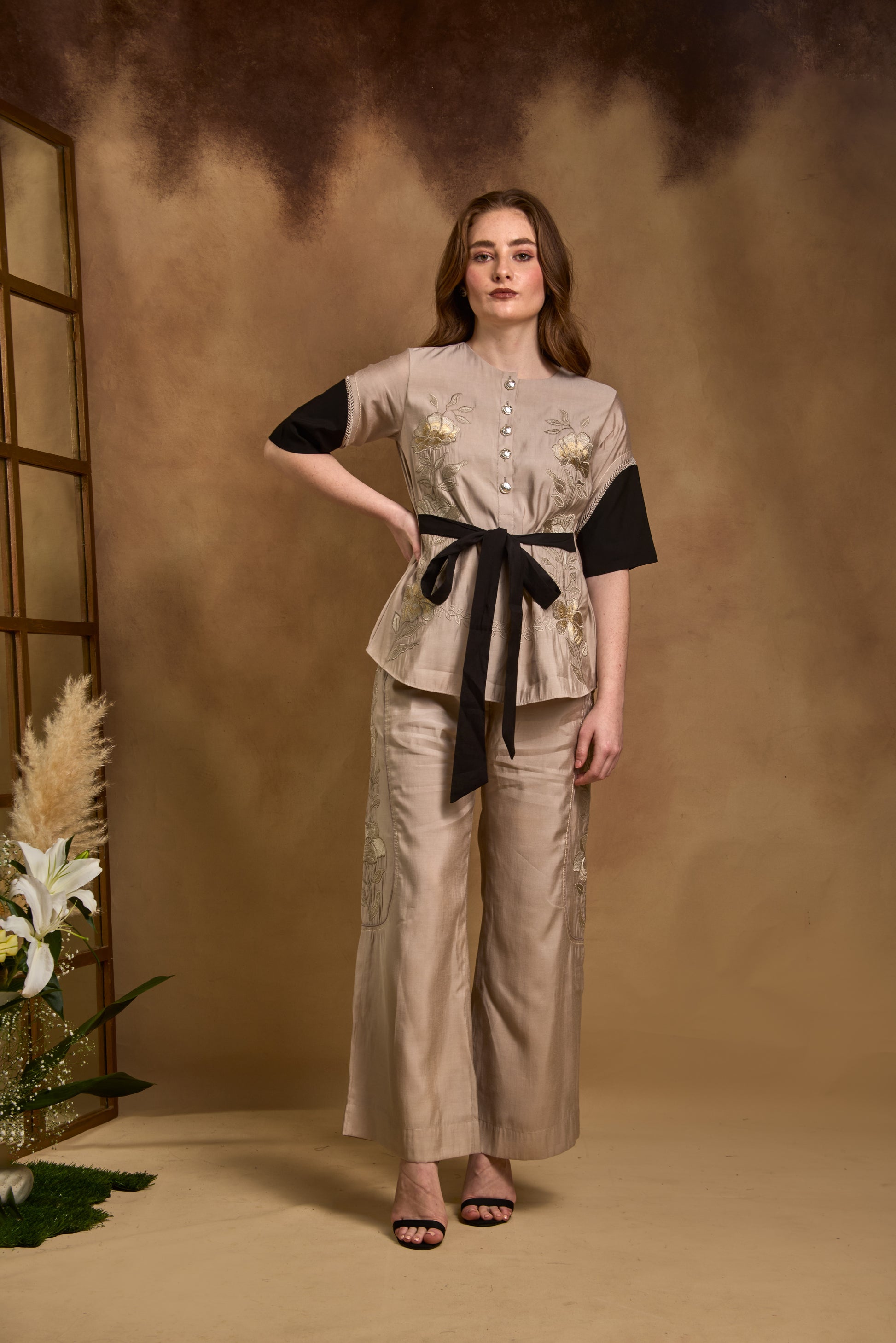 An embroidered shirt featuring color-blocked sleeves and a waist tie-up belt, paired with straight-fit trousers embroidered along the sides. The look is finished with round metal buttons, adding a refined edge to its modern, tailored appeal.