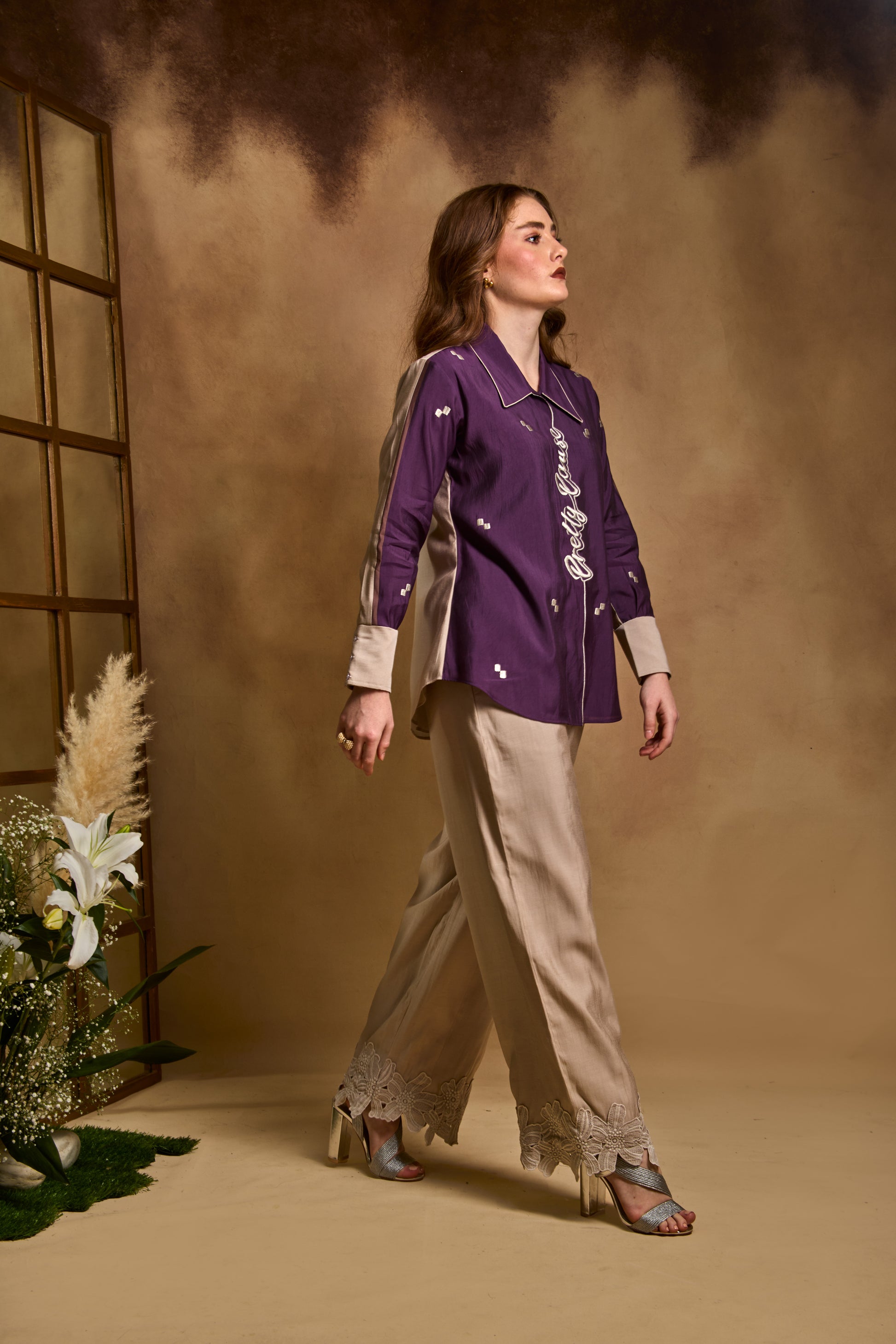 A typographic placket-detailed front-button shirt, designed as a signature collection piece with color-blocked sleeves and back panels, paired with straight-fit trousers featuring a delicate lace-trimmed hem.