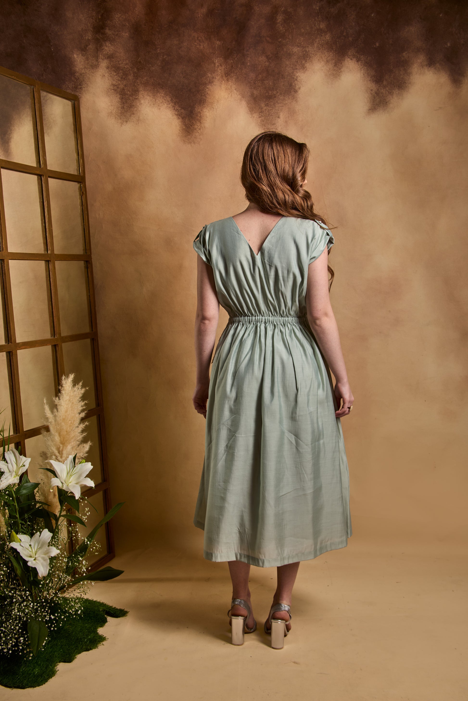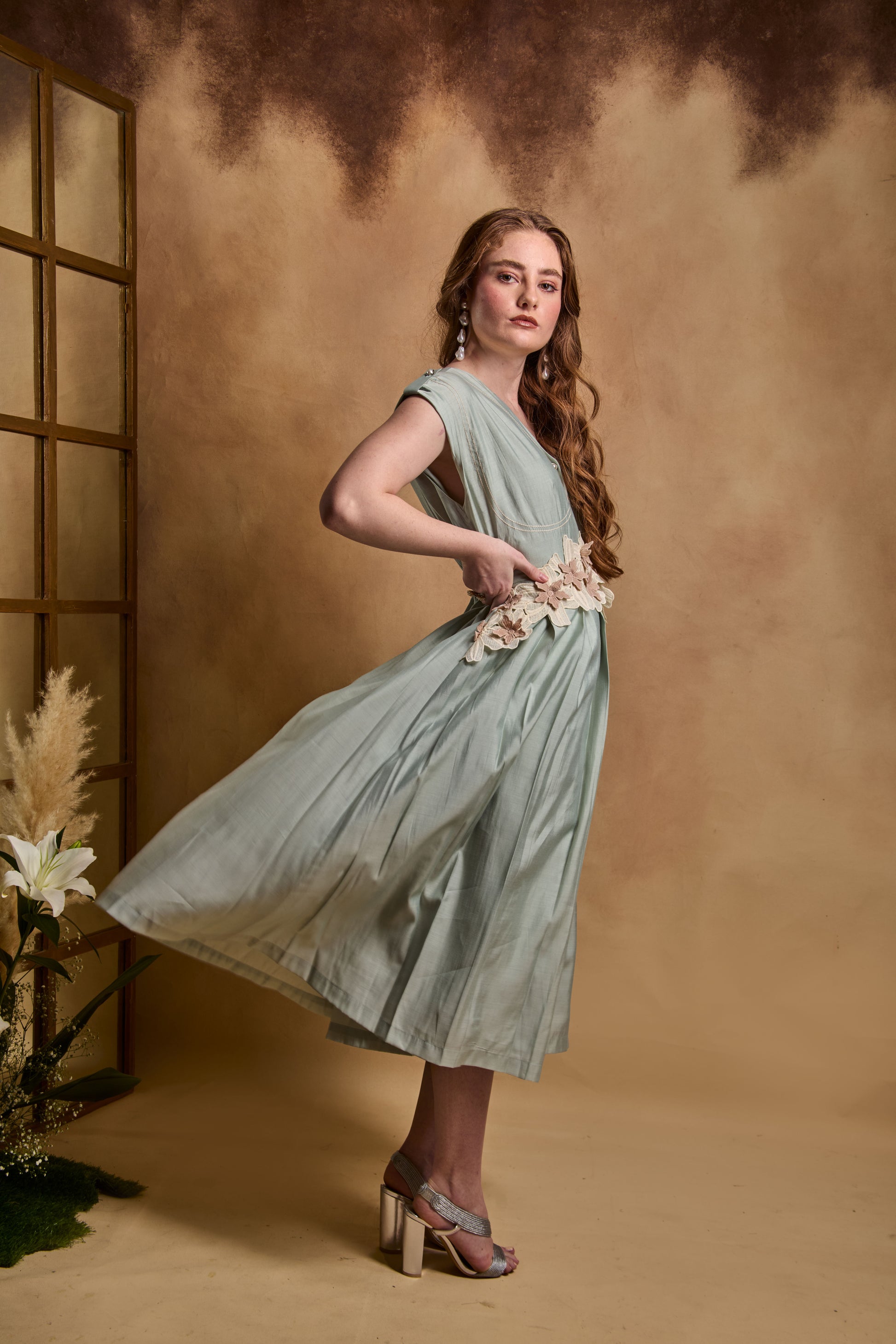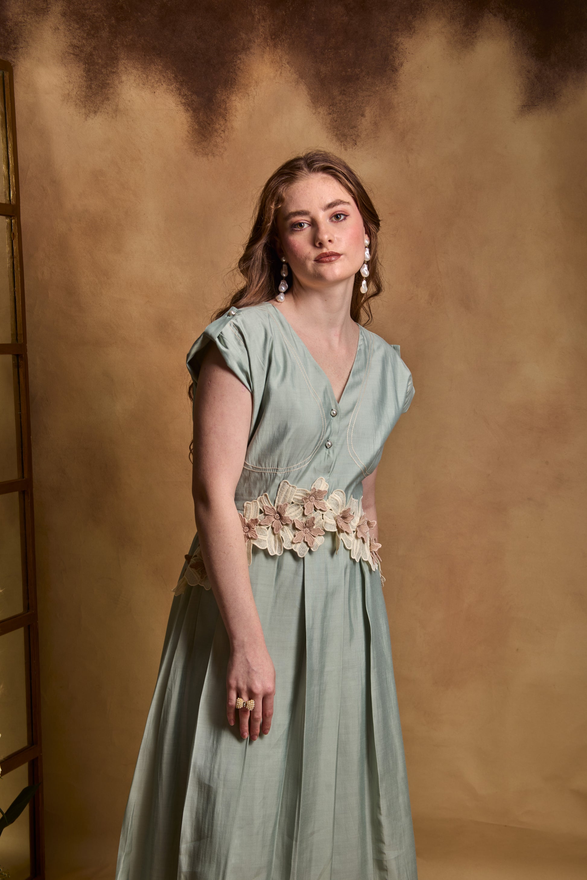 A box-pleated skirt dress adorned with 3D lace detailing at the waist, featuring a V-neckline with pearl button closure. The silhouette blends structured femininity with delicate embellishment, creating a look that’s both elegant and timeless.