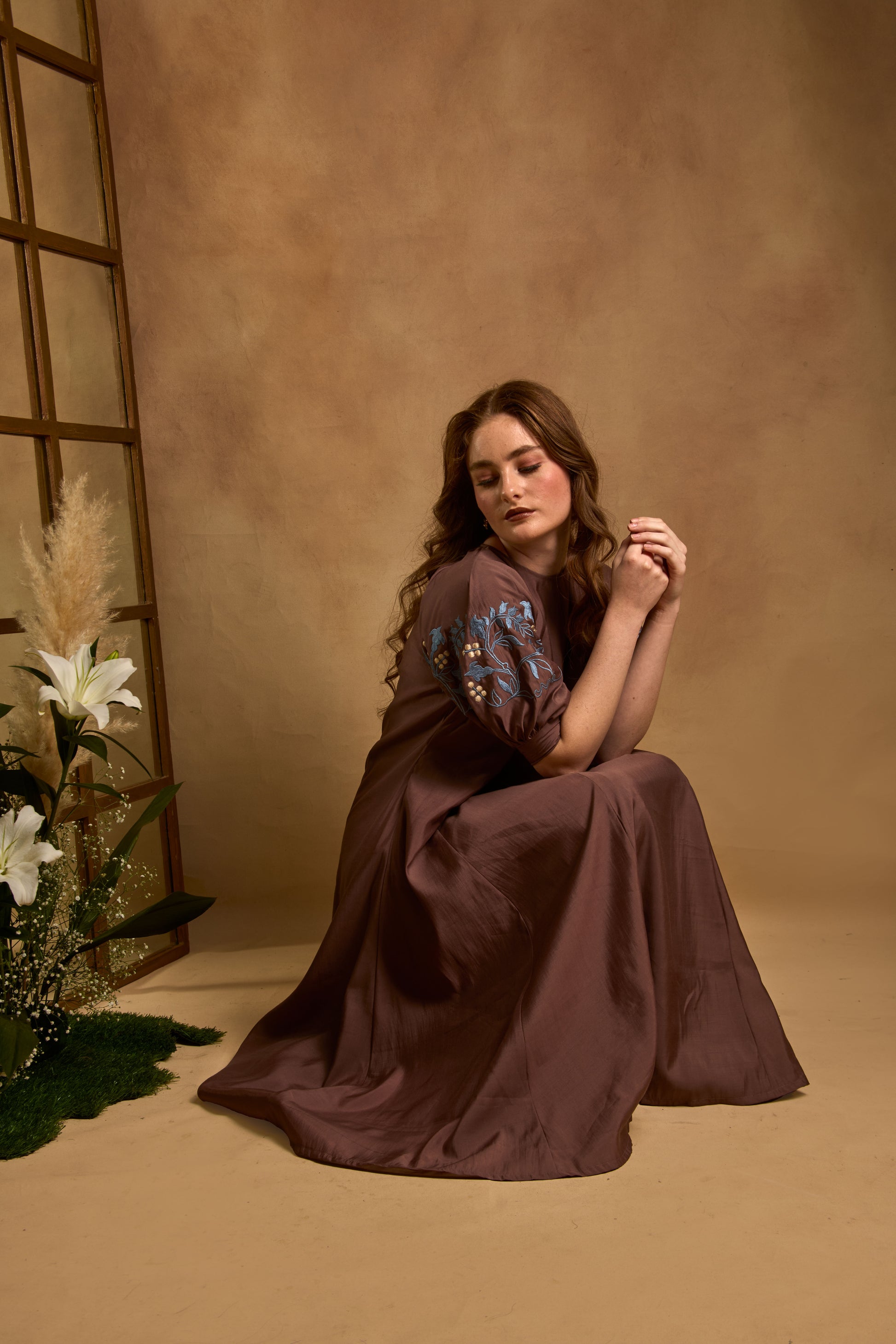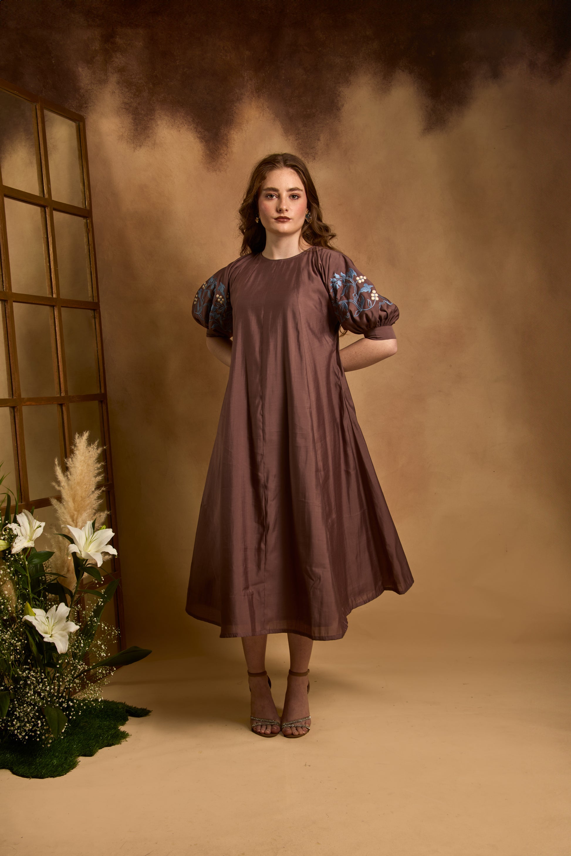 A flared, paneled dress featuring Victorian-inspired sleeves and intricate embroidery with cutwork detailing, designed for a comfortable yet elegant silhouette. Finished with a concealed back zip closure, it blends classic inspiration with modern tailoring.