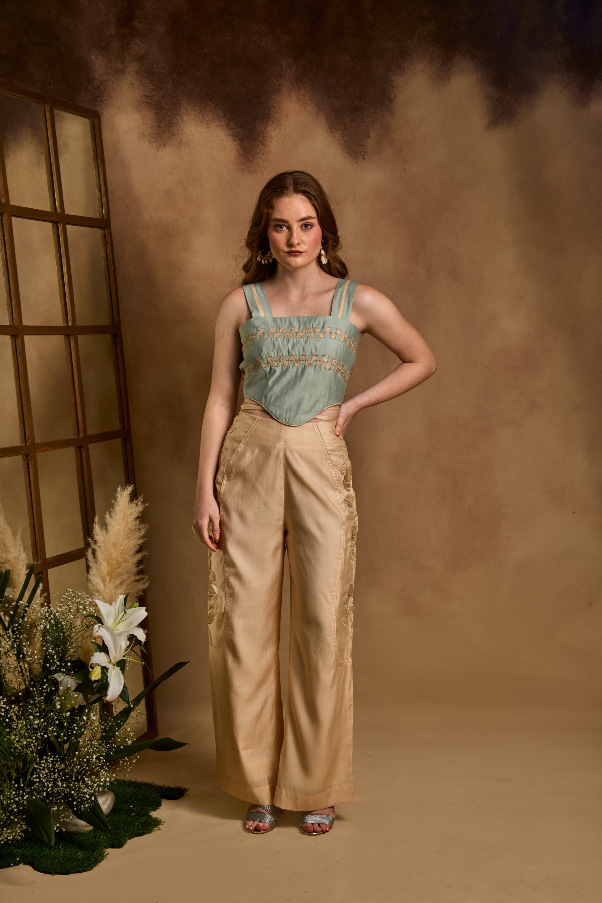 A subtle expression of florals, featuring tonally embroidered statement trousers paired with an asymmetric crop top adorned with geometric embroidery patterns. The pants include a loop-tie waist adjustment for a custom fit.