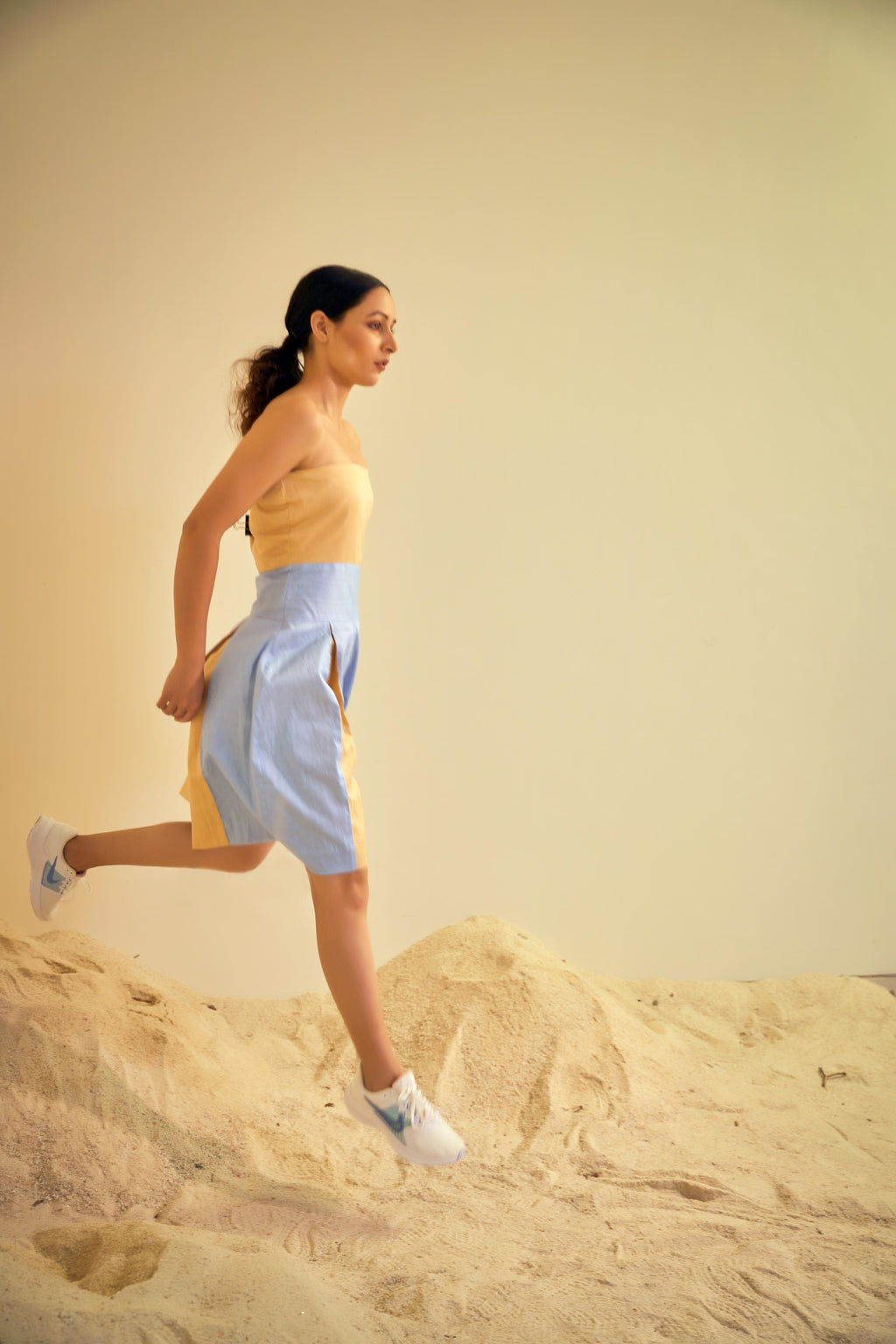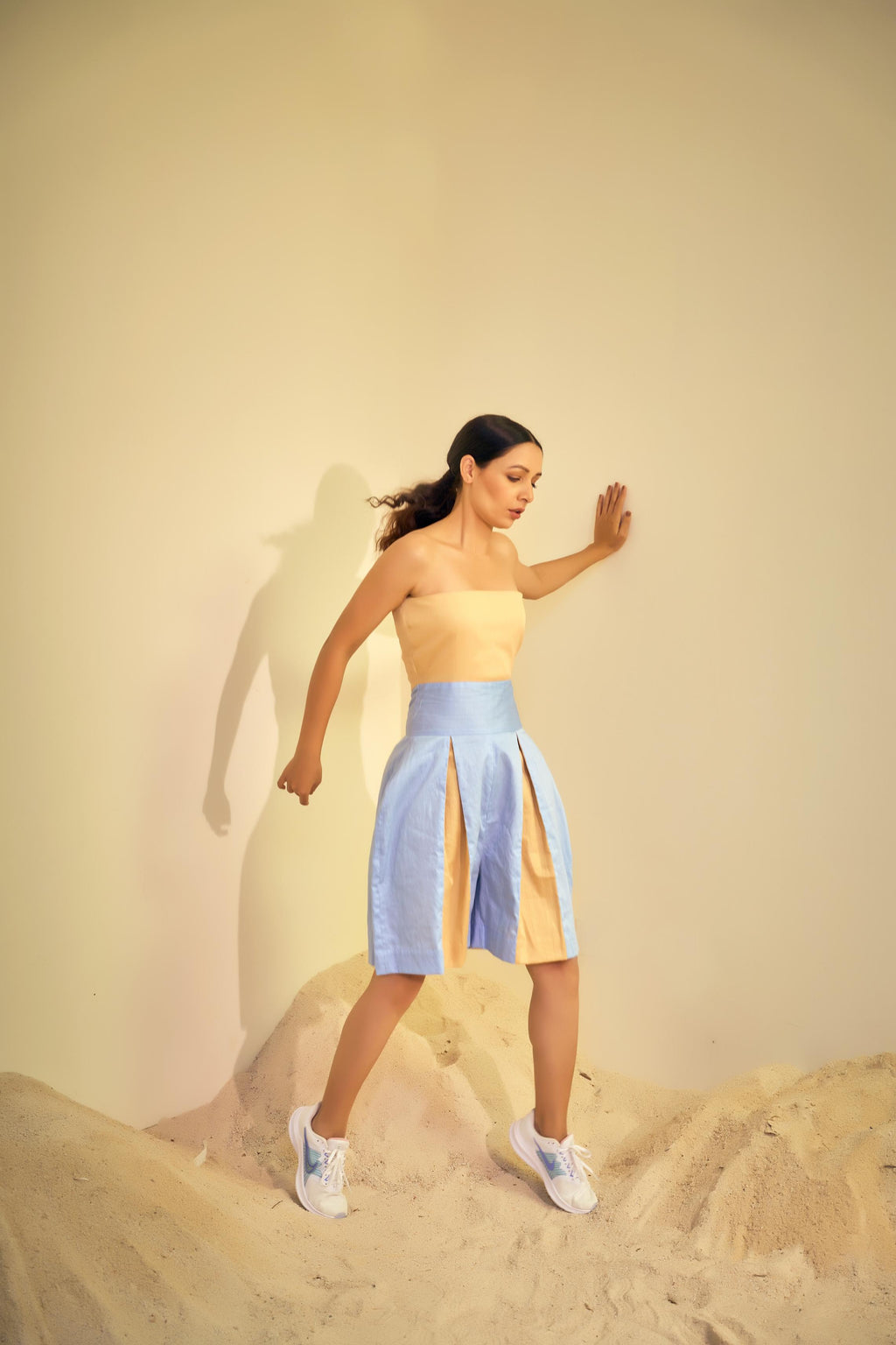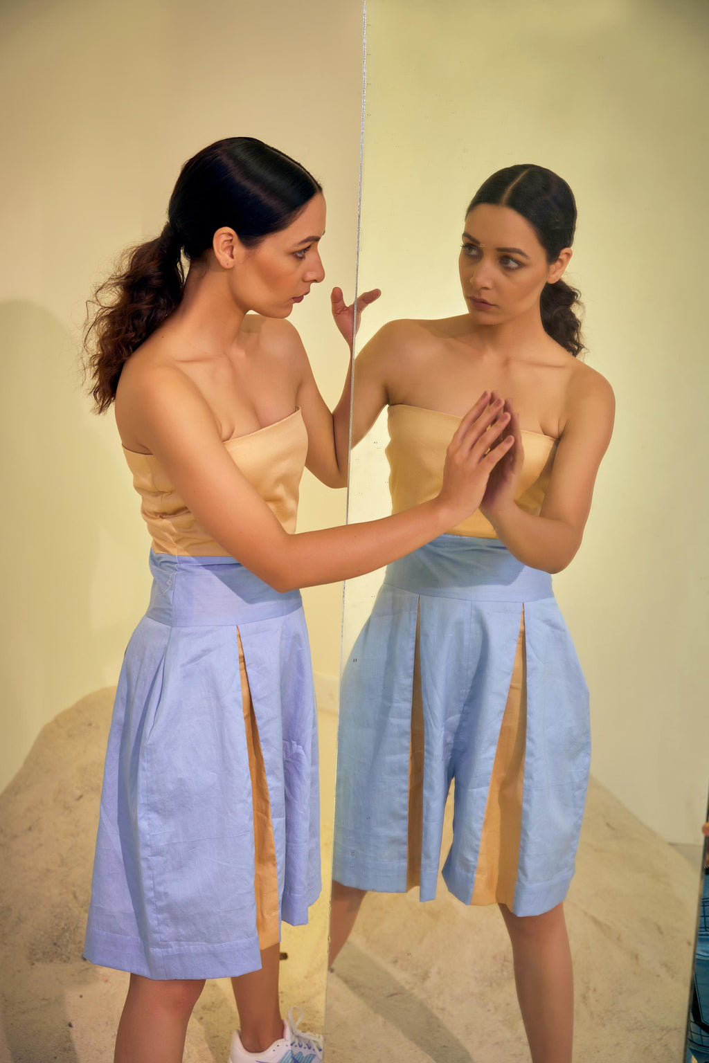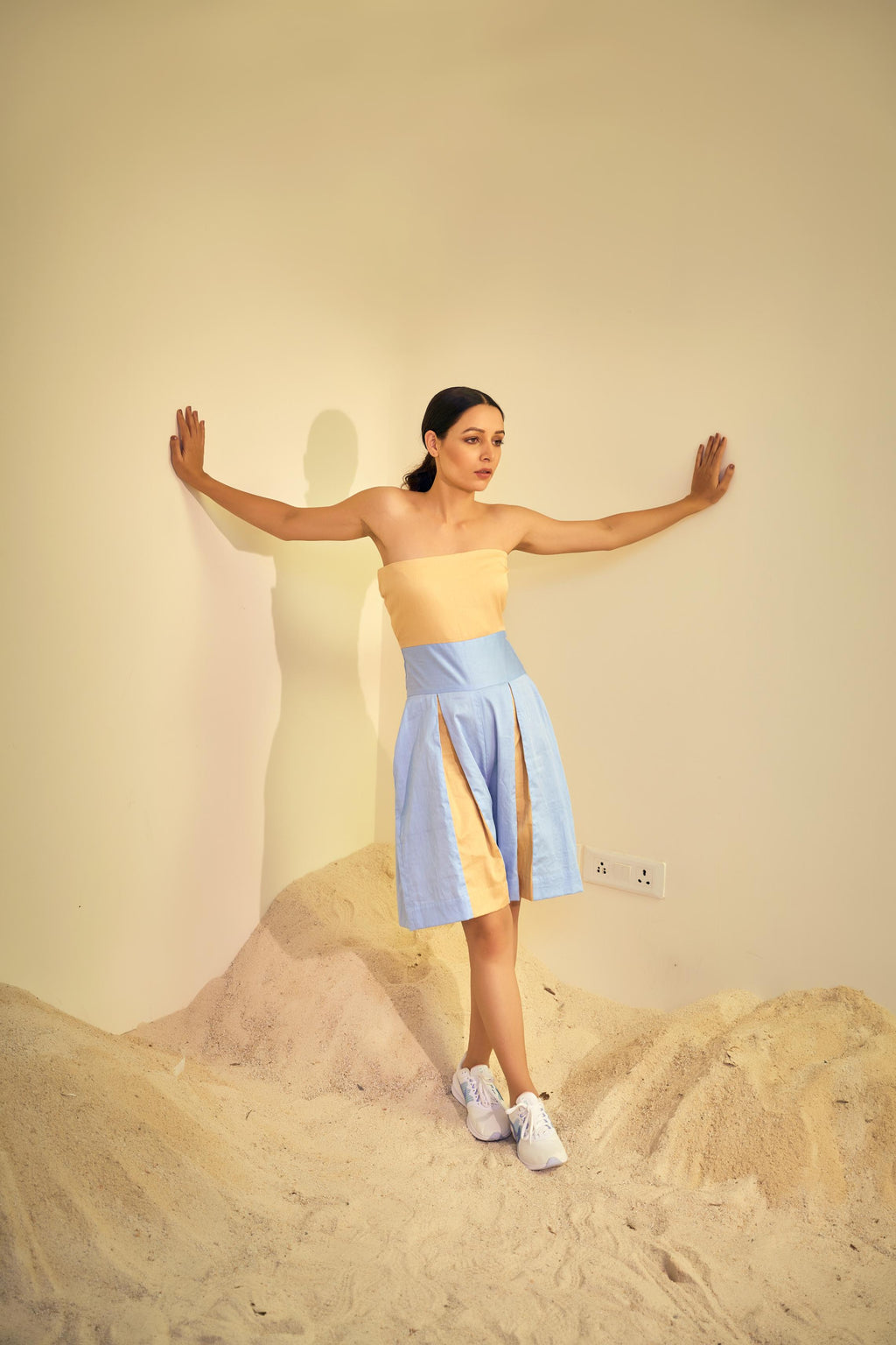 Nova is a very comfortable color block off-shoulder romper with inverted pleat shorts. It comes with a back zipper closure.
