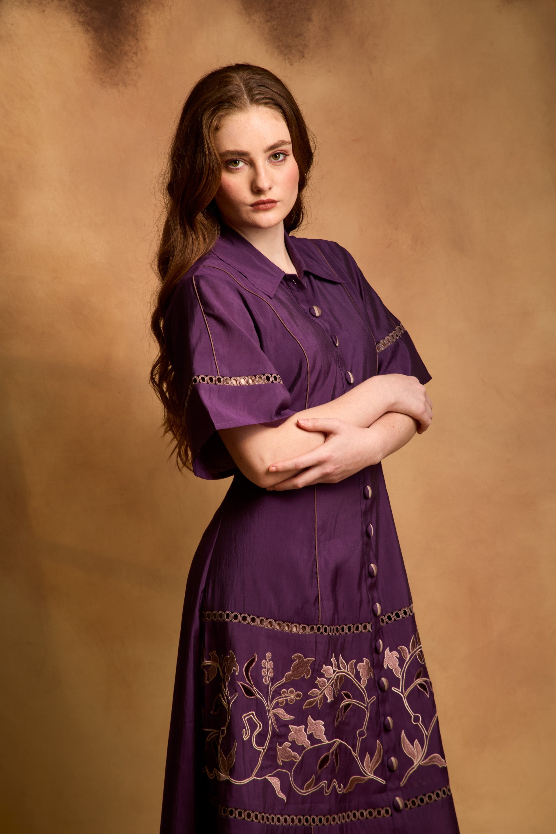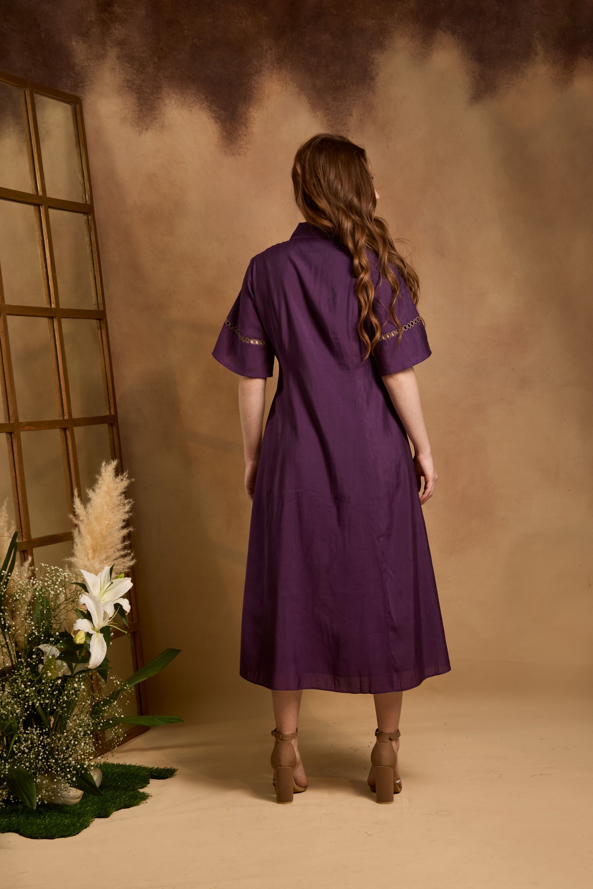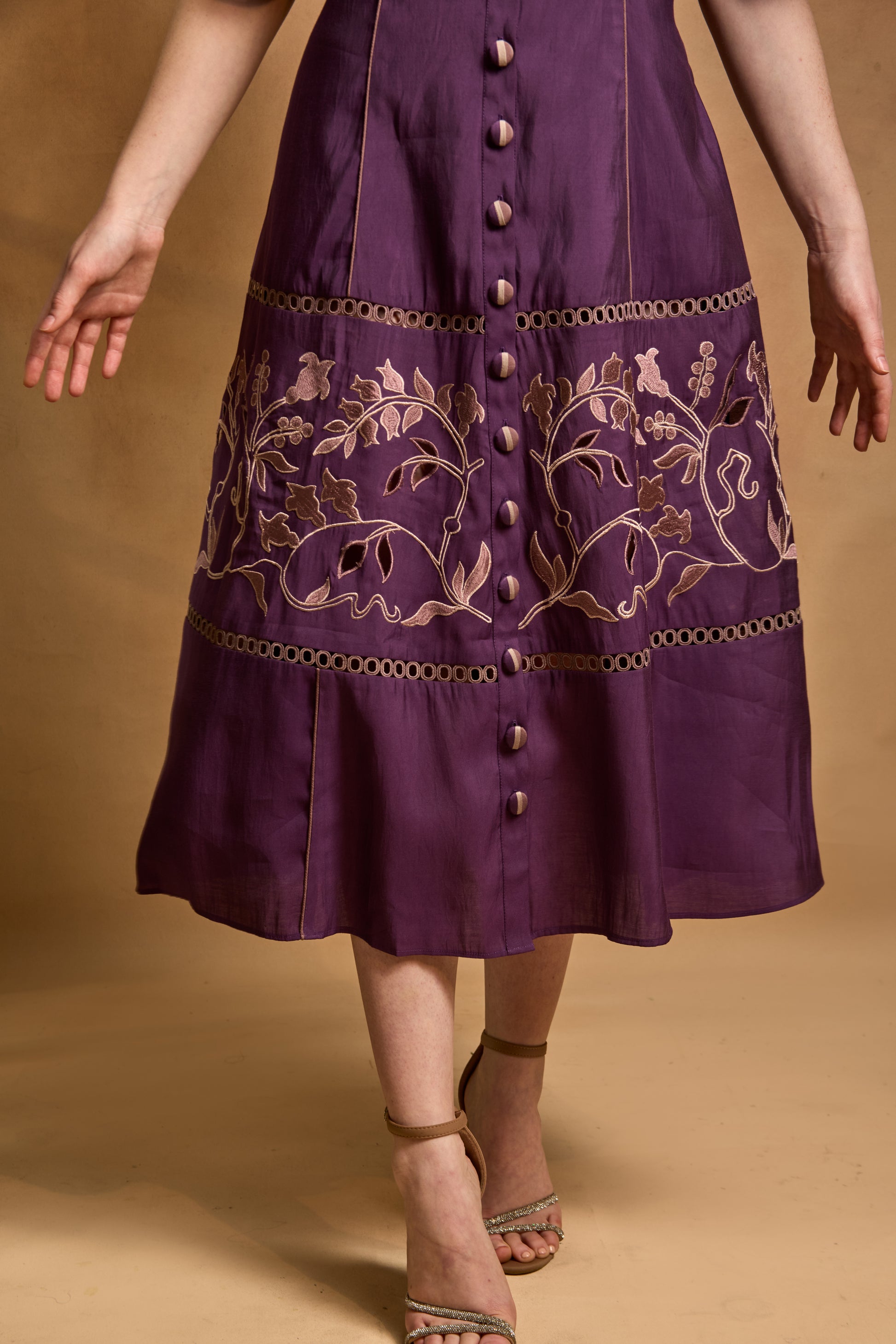 A fit-and-flare dress featuring panel embroidery intricately combined with delicate lace inserts, creating a textured, feminine silhouette that balances structure with graceful detailing.