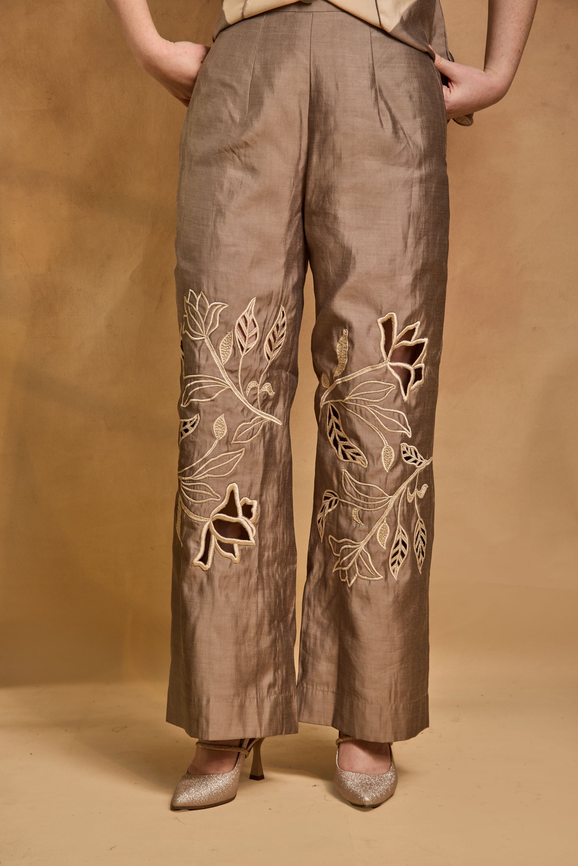A monotone co-ord set adorned with all-over lace appliqué detailing, designed as a smart and comfortable wardrobe essential.