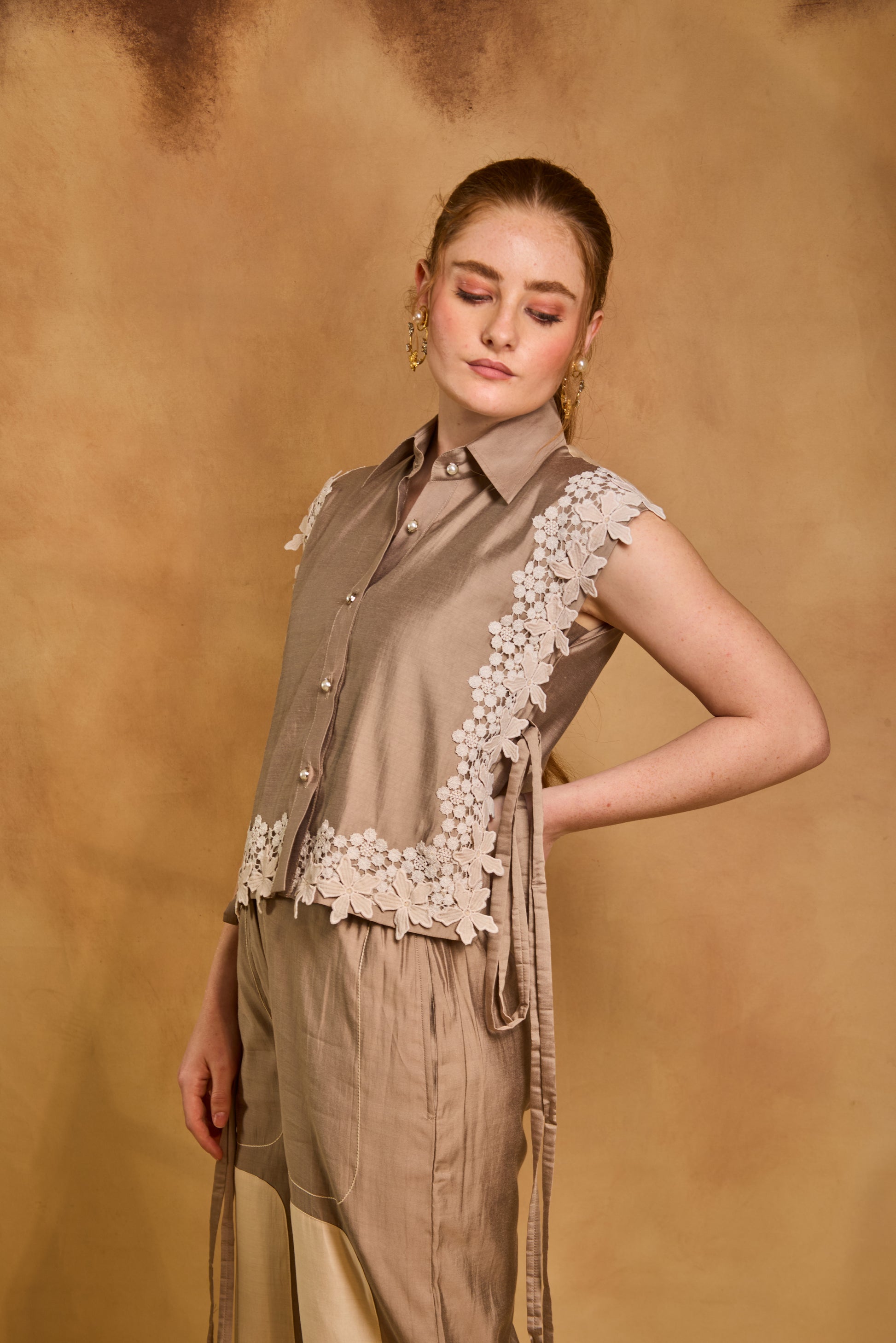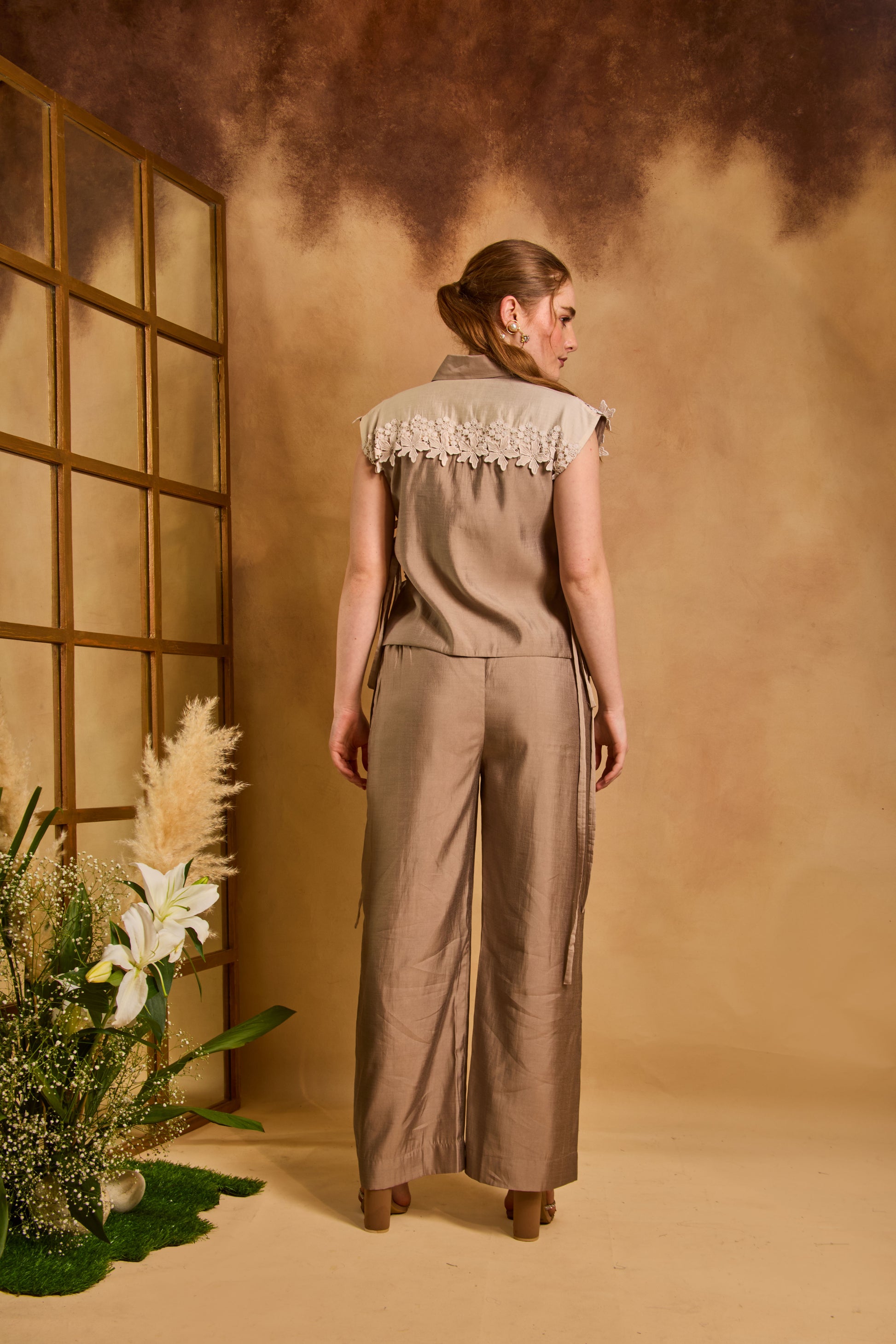 A relaxed-fit, dressy co-ord set featuring a cropped shirt adorned with intricate floral embroidery, paired with trousers featuring matching waistline embroidery, side pockets, a side zipper closure, and color-blocked side panels.